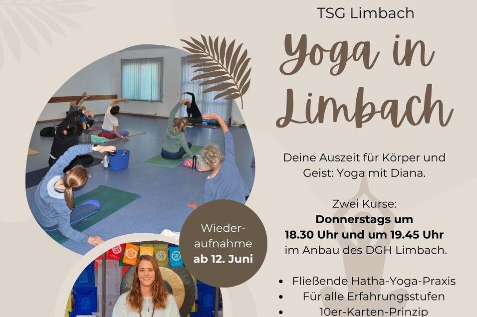 Auf Grund der hohen Nachfrage geht unser Yogakurs bei der TSG Limbach mit zwei Kursen pro Abend weiter. Ab 23. Mai fortlaufend, immer donnerstags um 18:30 Uhr und um 19:45 Uhr (jeweils 1 Stunde) im Anbau des DGH Limbach. Mit unserem Zehnerkartensystem kannst du flexibel teilnehmen, ganz nach deinem Zeitplan – Anmeldung für die Stunden vorab online.